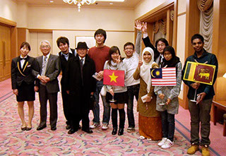 途中、留学生達の母国にまつわるクイズが出題され、なかなか解らない問題に大いに盛り上がり正解した留学生に景品が手渡されました。また、一人ひとりに自己紹介をしてもらい、若さあふれる彼らの夢や未来、そして母国の気候と日本の違いなどが話されました。皆一同に「皆様も一度私たちの国へお越しください」とのこと。
