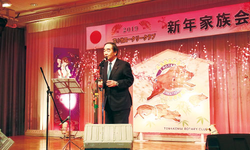 新年を迎え1月11日、恒例の新年家族会がグランドホテルニュー王子芙蓉の間で開催され、岩倉市長、令夫人をはじめ、会員、ご家族の方々が大勢参加されました。